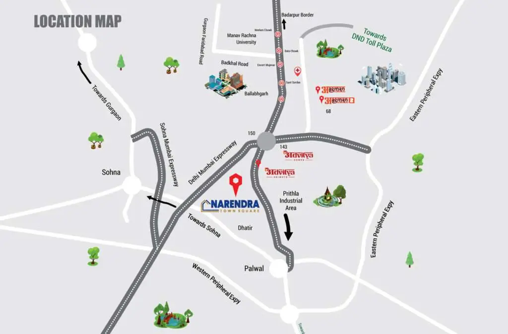 Discover unparalleled living and investment opportunities at Narendra Town Square and Advitya Plots, developed by Narendra Infra (part of the Shivalik/Advitya Group). Located in the coveted Sector 6, Prithla, South Faridabad, these projects offer luxurious yet affordable residential plots under the Deen Dayal Jan Awas Yojana (DDJAY-2016).